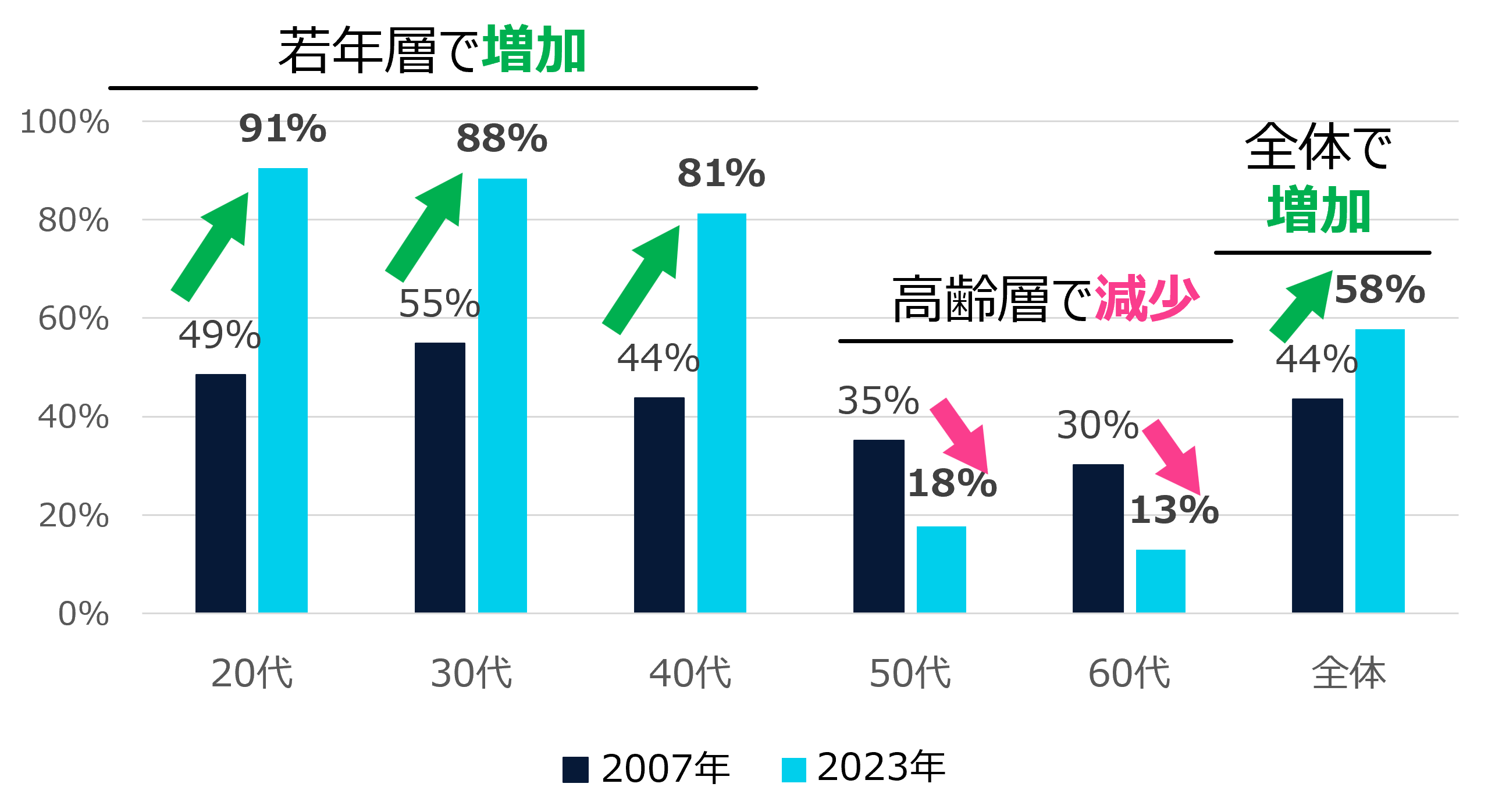 2003年時点では、年代による資産配分の違いは限定的で、年齢に応じたメリハリは必ずしも明確ではなかった。しかし2023年には、若年層ほど株式比率が高く、高齢層ほど低いという傾向が明確となり、年齢に応じた資産配分が制度全体として実現されていったことが分かる。