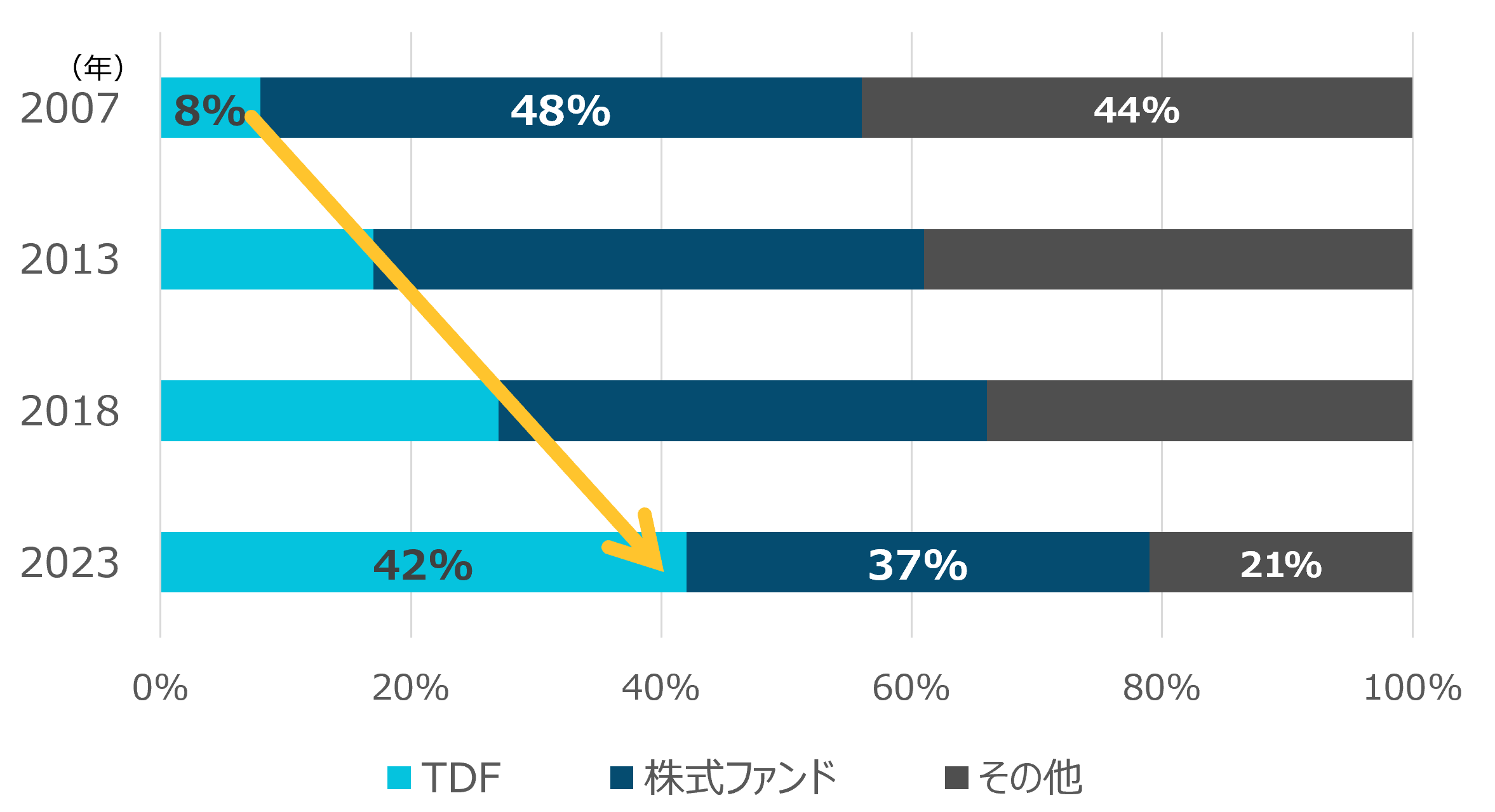 もっとも、2007年当初、TDFは401(k)プラン全体残高の8%にすぎず、決して主流の商品ではなかった。しかしその後年金保護法の後押しから着実に浸透し、2023年には42%を占め、株式ファンドを上回る残高となっている(図⑧)。