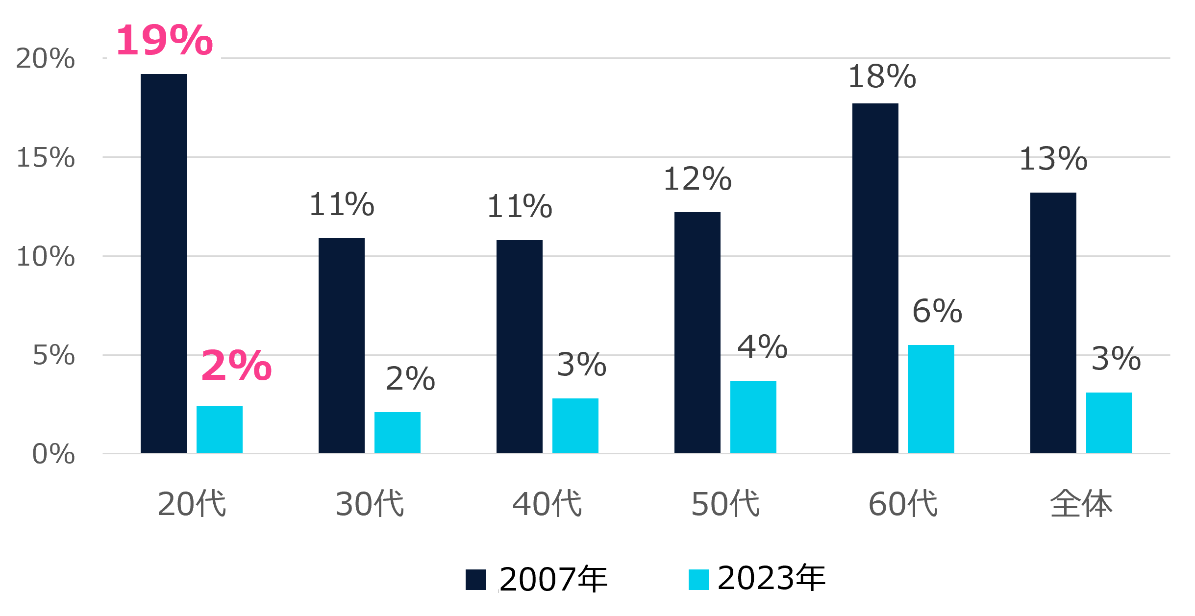 TDFの普及は、年金保護法が問題意識としていた「資産配分の歪み」に対しても一定の成果をもたらした。2007年時点では、株式配分比率を0%としている20代の加入者が19%も存在していた(図⑨)。これでは、長期で期待される株式リターンの恩恵を十分に享受できず、DC制度の本来の趣旨に照らして望ましい状態とは言い難い。しかし、TDFの普及もあり、2023年にはその割合は2%まで低下している。