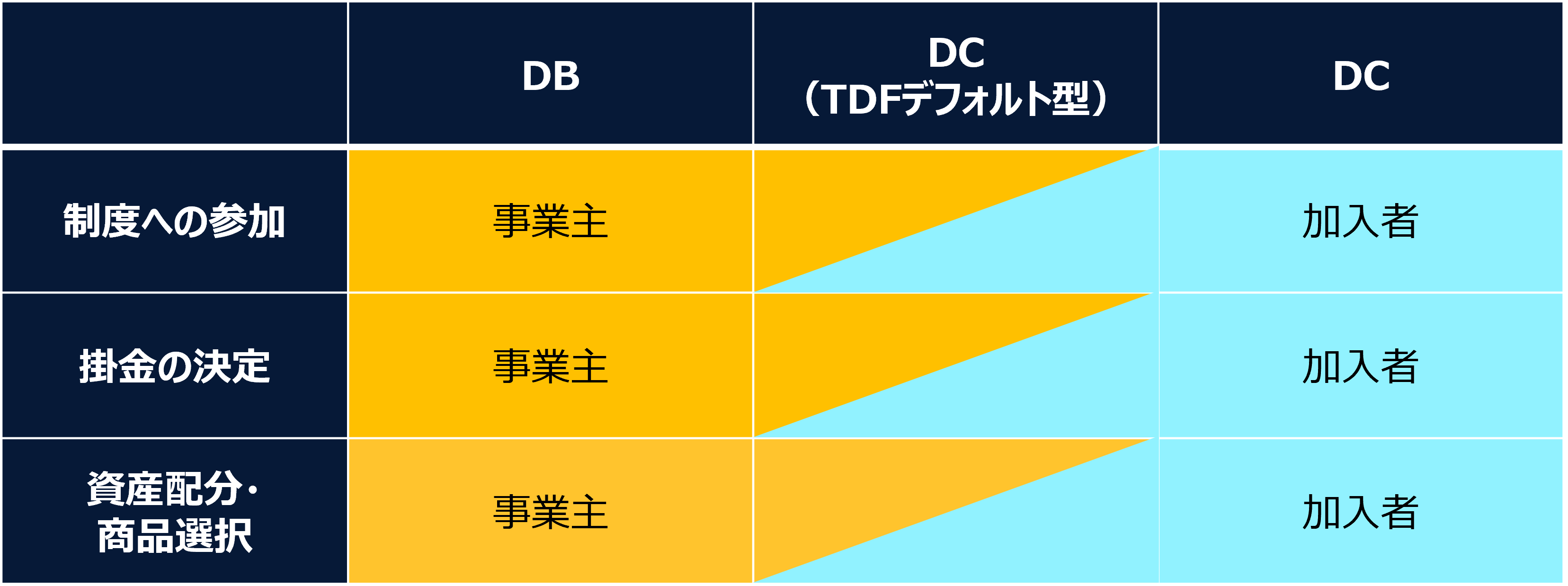 この違いは、一見すると制度上の細かな差に見える。しかし、加入者の意思決定には極めて大きな影響を与えている。図④では、DBも含めて日米の制度における意思決定主体を整理している。