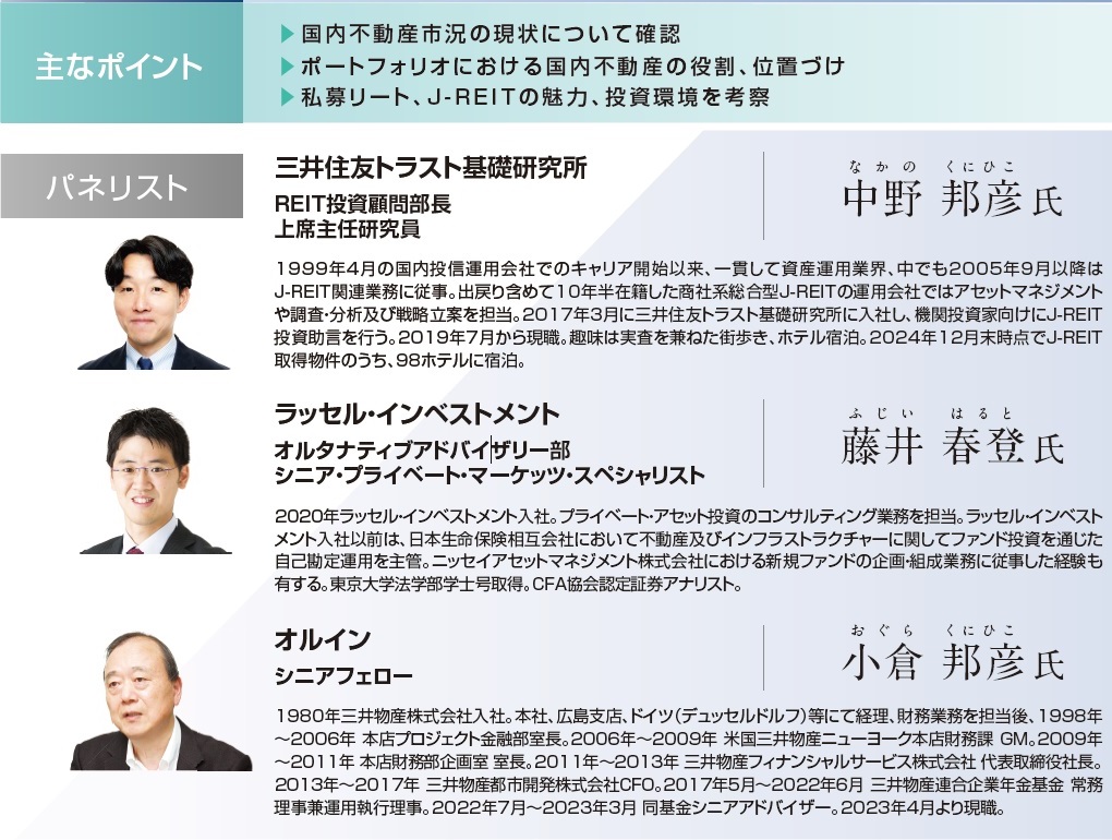 不動産に明るい識者の皆さまをお招きし、国内不動産市場の現況を振り返りつつ、投資家ポートフォリオにおける不動産の役割や位置づけについて議論を深めていきます。また、投資家にも馴染みのある私募リート、Jリートの現在の投資環境についても考察していきます。