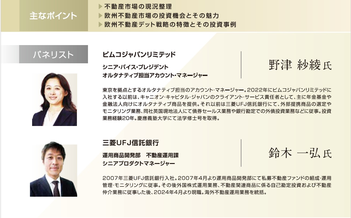 ピムコジャパンリミテッド 野津 紗綾 氏、三菱UFJ信託銀行 鈴木 一弘 氏を壇上に迎え、大きく変動する不動産市場の現況整理をしつつ、欧州不動産デッドの魅力と投資機会についてのディスカッションを行います。お見逃しのないよう早めにお申込みください。なお、見逃し配信もございますので、当日のご都合が付かない方もぜひお申込みください。皆様のご参加をお待ちしております。