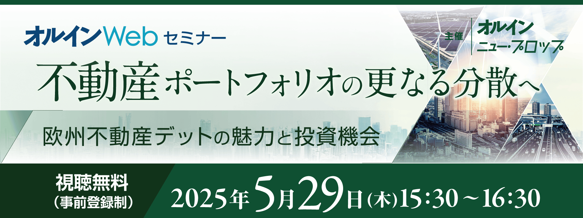 2025年5月29日(木)15:30 より、オンラインセミナー「不動産ポートフォリオの更なる分散へ ~欧州不動産デットの魅力と投資機会~」を開催致します。