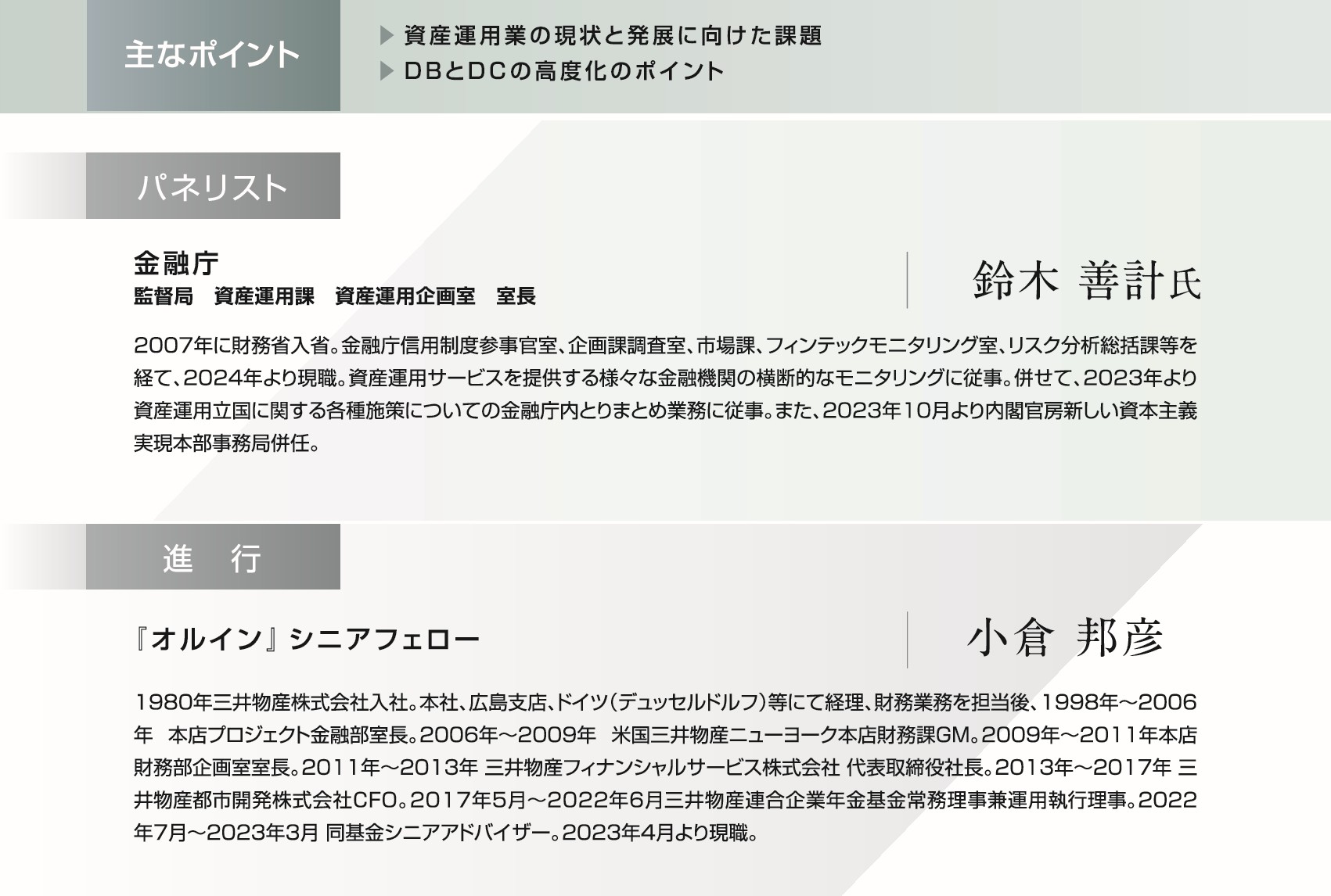 金融庁の監督局資産運用課資産運用企画室 室長の鈴木善計氏をお迎えし、プログレスレポートのポイントと企業年金が取るべき対応についてのディスカッションを行います。お見逃しのないよう早めにお申込みください。なお、見逃し配信もございますので、当日のご都合が付かない方もぜひお申込みください。皆様のご参加をお待ちしております。