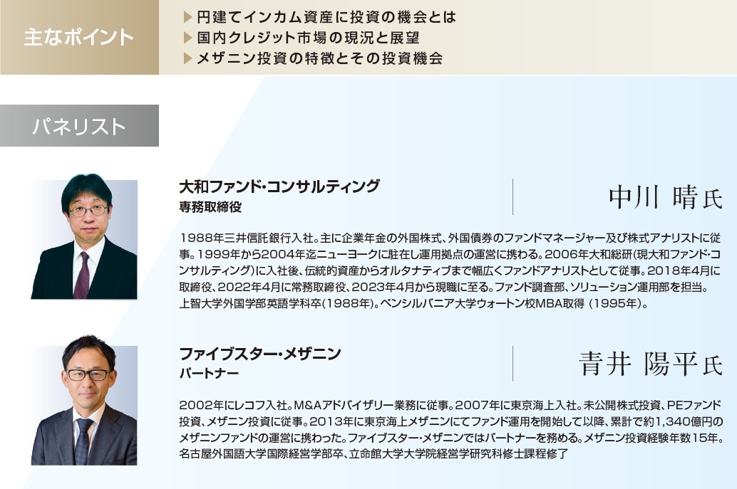 大和ファンド・コンサルティングの中川 晴 氏とファイブスター・メザニン 青井 陽平氏をお迎えし、円建てインカム資産の魅力と機会についてディスカッションを行います。