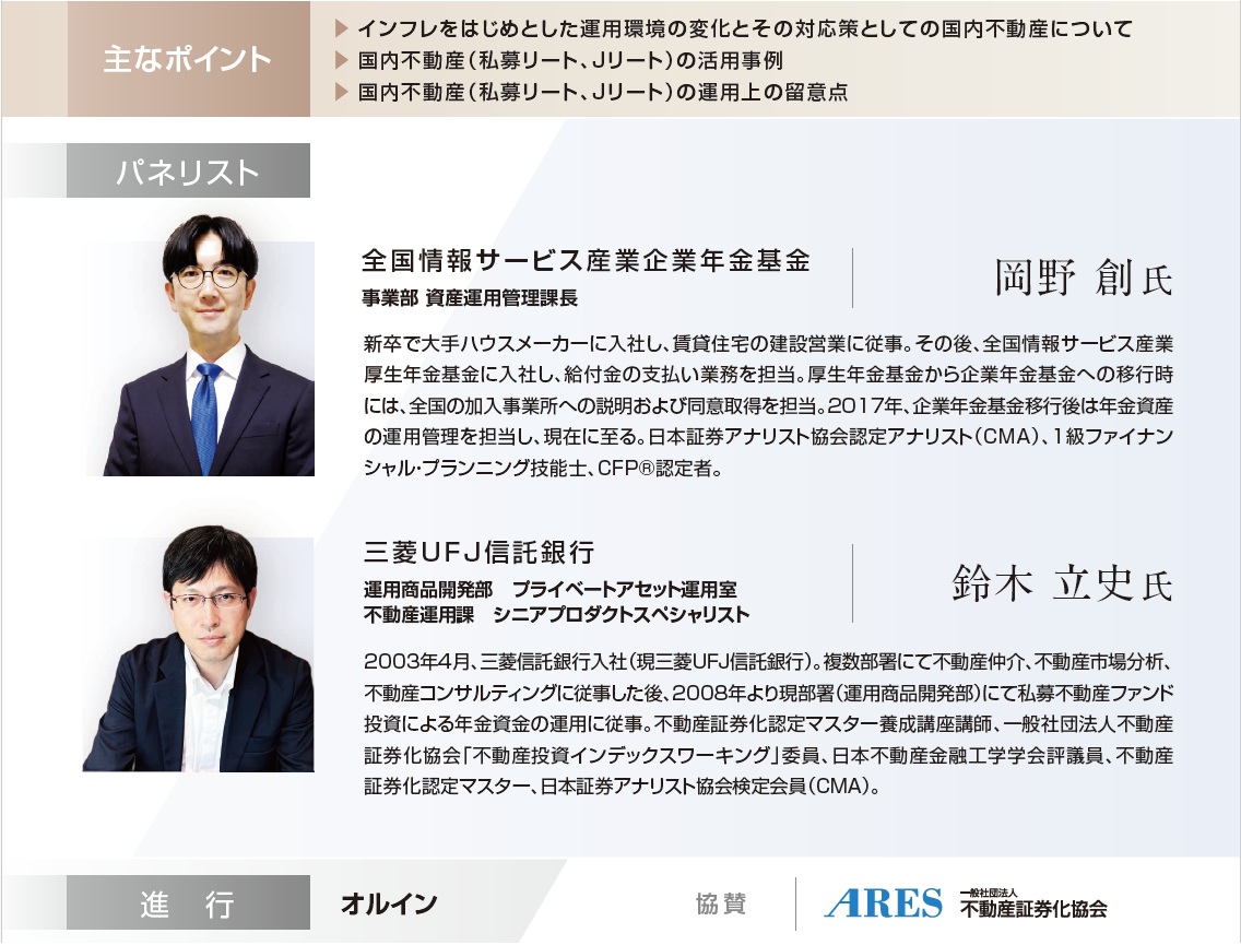 当日は全国情報サービス産業企業年金基金の岡野 創 氏と、三菱UFJ信託銀行の鈴木 立史 氏をお招きし、インフレをはじめとした運用環境の変化を振り返りつつ、その対応策としてポテンシャルがあるという国内不動産(私募リート・Jリート)について議論を深めていきます。