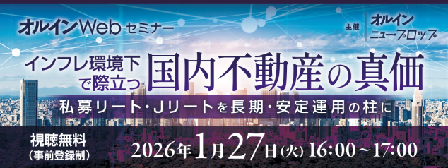 平素より機関投資家向け運用情報誌「オルイン」「ニュープロップ」をご愛読いただき誠にありがとうございます。2026年1月27日(火)16:00より、オルインWebセミナー「インフレ環境下で際立つ国内不動産の真価~私募リート・Jリートを長期・安定運用の柱に~」を開催いたします。