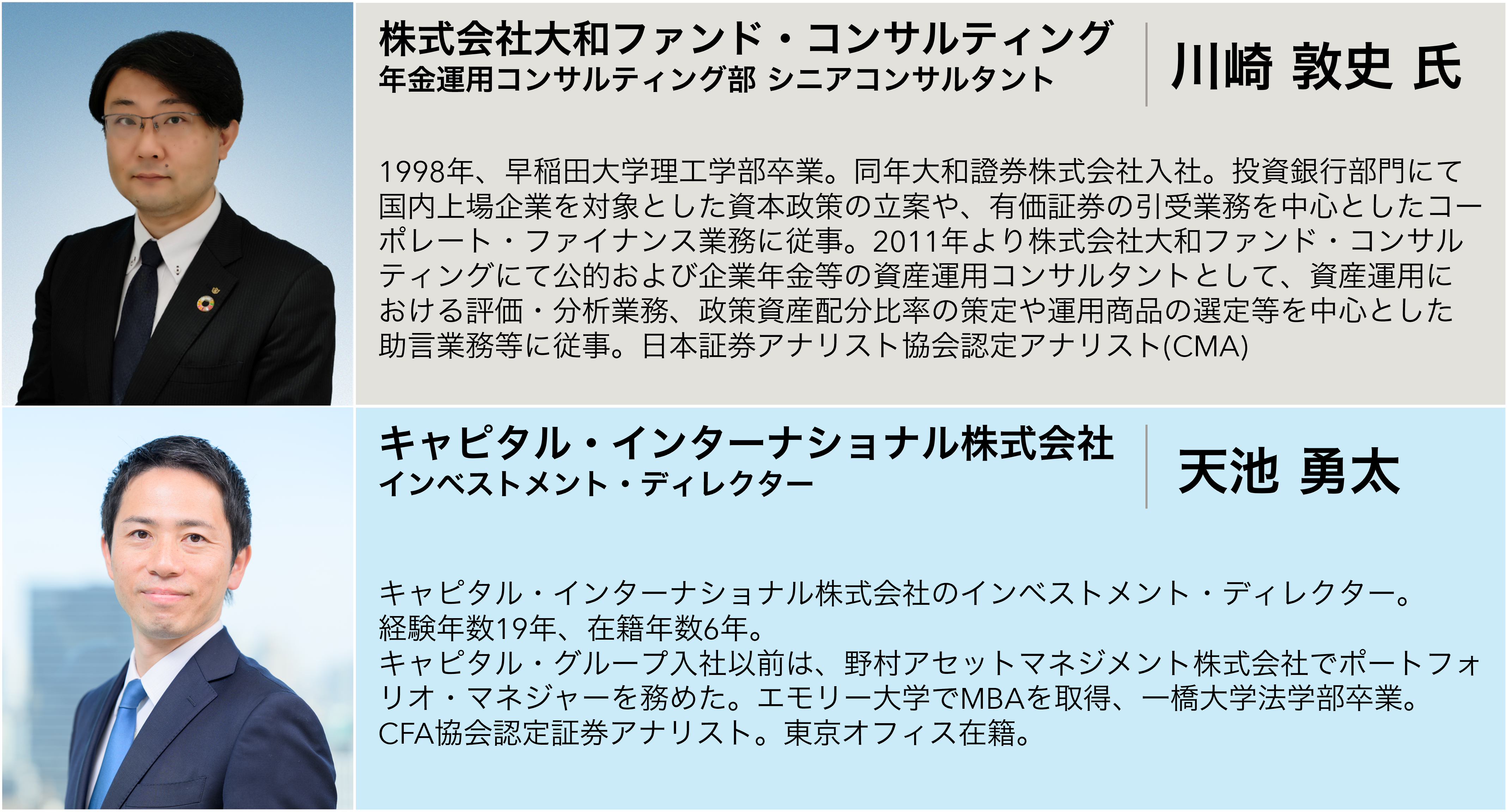 本セミナーでは、大和ファンド・コンサルティングのシニアコンサルタントである川崎氏をお招きし、年金運用のポートフォリオにおいて期待される外国株式アクティブ戦略の役割についてご講演いただきます。