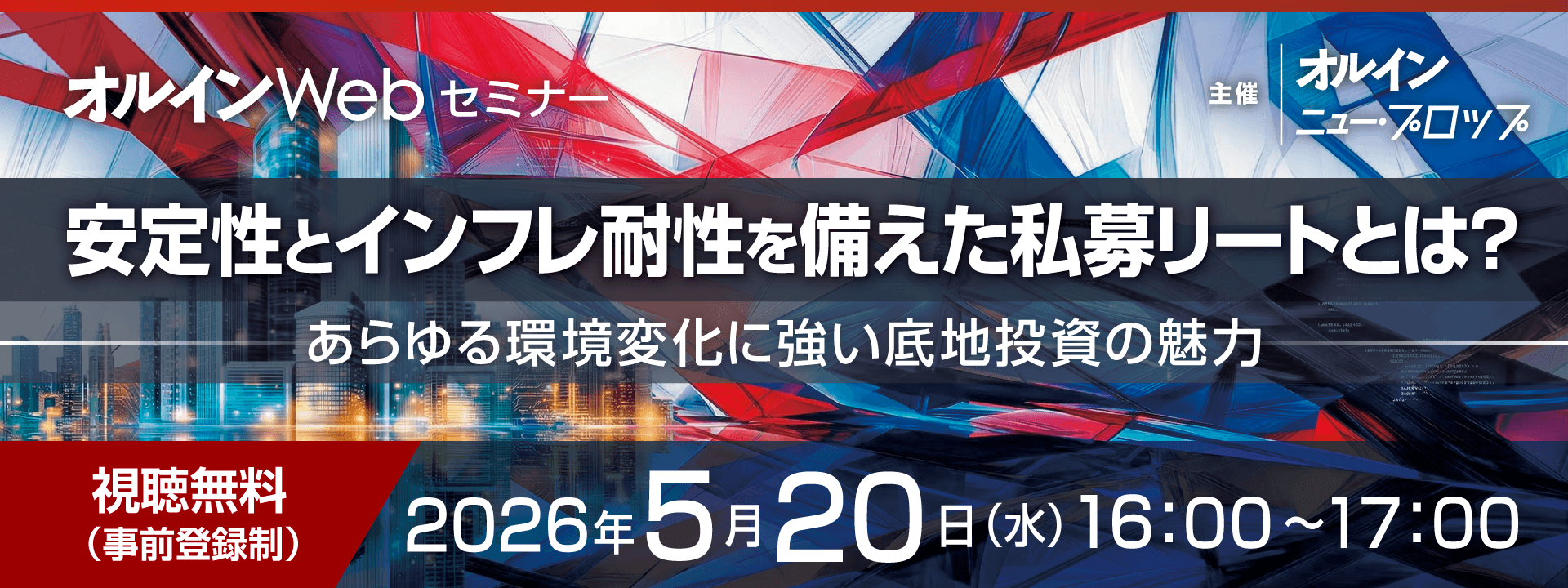 平素より機関投資家向け運用情報誌「オルイン」「ニュー・プロップ」をご愛読いただき誠にありがとうございます。2026年5月20日(金)16時より、オルインWebセミナー「安定性とインフレ耐性を備えた私募リートとは?~あらゆる環境変化に強い底地投資の魅力~」を開催いたします。