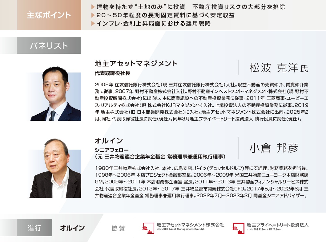 当日は地主アセットマネジメントの松波 克洋 氏をお招きし、オルイン シニアフェローの小倉 邦彦と、インフレ耐性を高める「底地投資」の優位性や、建物リスクを排除して超長期の安定収益を確保する具体的な戦略について議論を深めていきます。