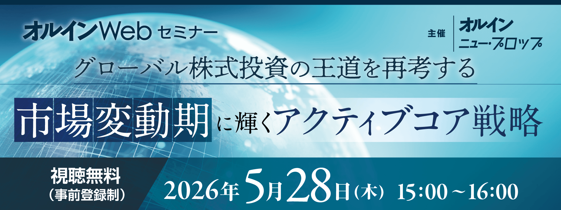 平素より機関投資家向け運用情報誌「オルイン」「ニュー・プロップ」をご愛読いただき誠にありがとうございます。2026年5月28日(木)15時より、オルインWebセミナー「グローバル株式投資の王道を再考する ――市場変動期に輝くアクティブコア戦略」を開催いたします。