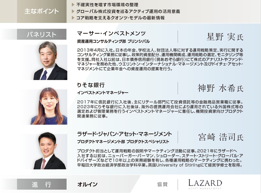 当日はマーサー・インベストメンツの星野 実氏、りそな銀行の神野 水希氏、ラザード・ジャパン・アセット・マネージメントの宮崎 浩司氏をお招きし、不透明な市場を乗り越えるためのグローバル株式戦略について議論を深めていきます。