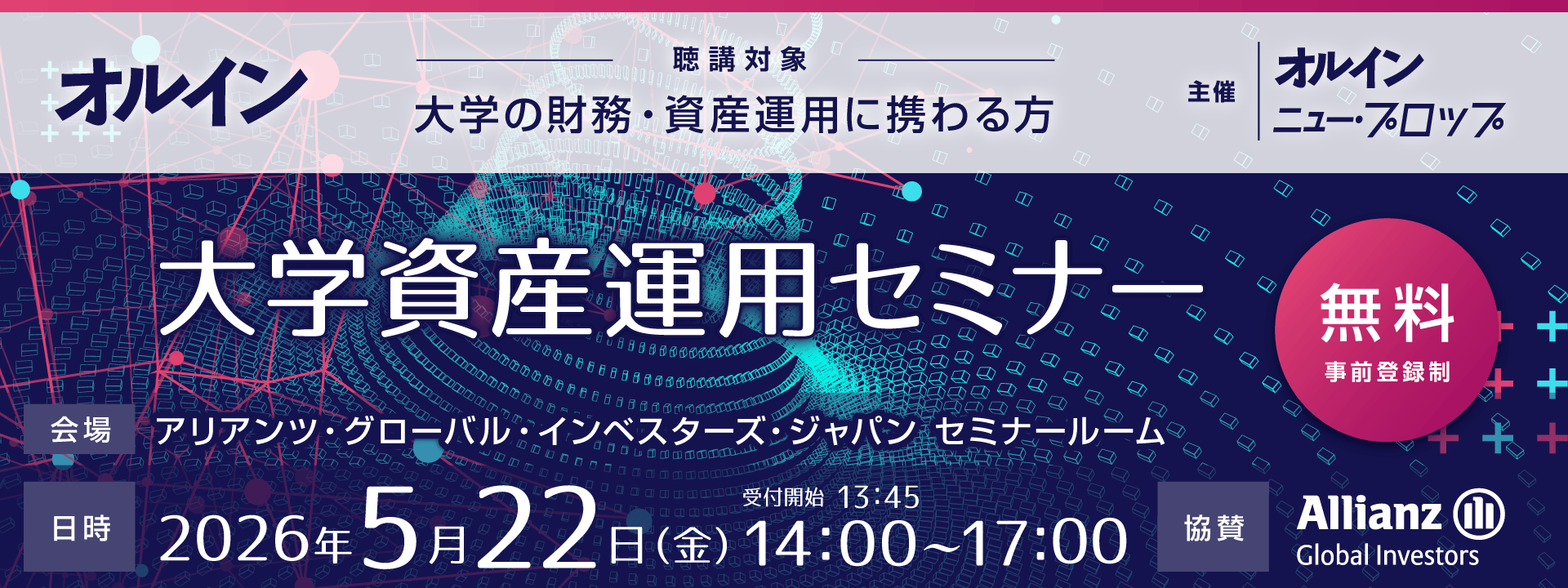 平素より機関投資家向け運用情報誌「オルイン」「ニュー・プロップ」をご愛読いただき誠にありがとうございます。弊誌では2026年5月22日(金)14時よりアークヒルズ サウスタワー19階 アリアンツ・グローバル・インベスターズ・ジャパン セミナールームにて、オルイン 大学資産運用セミナーを開催します。